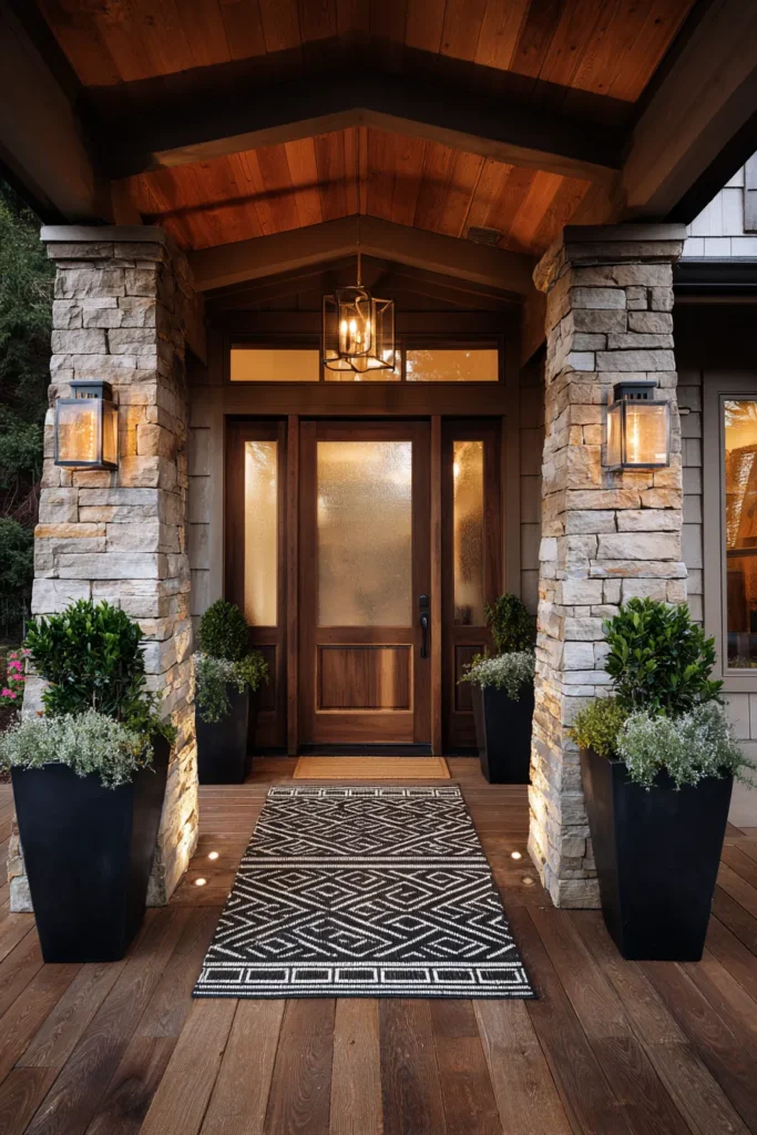 This porch features stone walls, a dark front door, and symmetrical planters that frame the entry beautifully. A patterned rug adds texture underfoot while warm lighting highlights the architectural details. Everything feels balanced and thoughtfully placed.