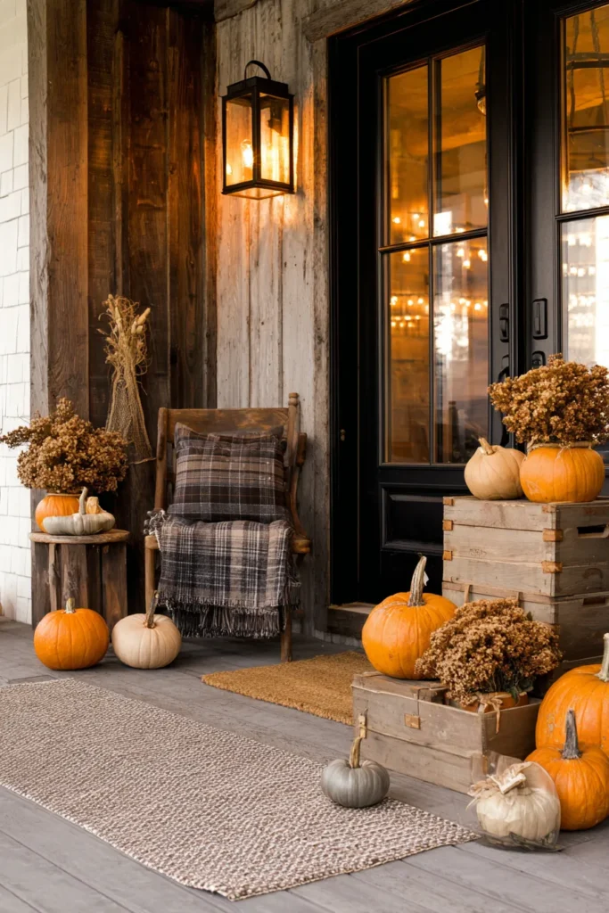This porch leans into warm tones with pumpkins, cozy textiles, and lantern style lighting. Natural textures like wood and woven rugs add depth while keeping the layout simple. Seasonal decor is layered without feeling cluttered.