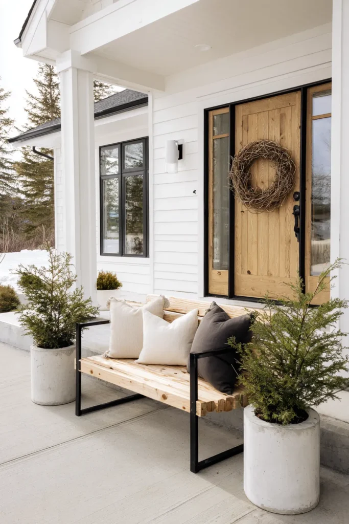 This front porch features a sturdy wooden bench layered with soft cushions and textured throws. Neutral tones, simple planters, and natural wood details keep the space feeling relaxed and grounded. The layout stays open while still offering a comfortable place to sit.