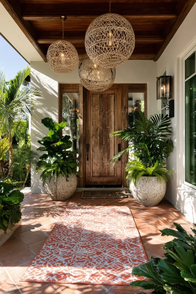 This porch features lush plants, warm wood finishes, and layered rugs that bring in a relaxed tropical vibe. Hanging lights and organic materials soften the structure of the space. Everything feels warm and casual.