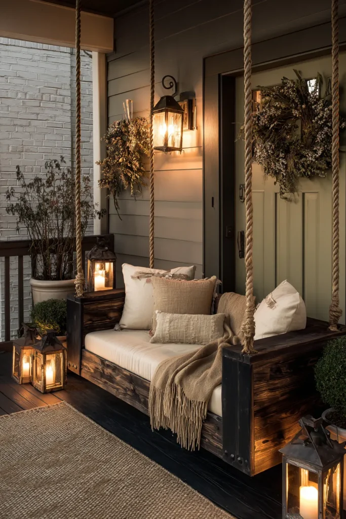 This porch centers around a built in bench layered with pillows and soft throws. Lanterns and warm wall lighting create a gentle glow in the evenings. The decor feels intimate and thoughtfully arranged.