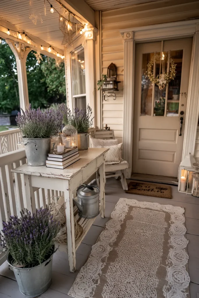 This porch combines light paint, antique inspired furniture, and gentle decor details. A runner rug and small table add charm without taking up too much space. The look feels collected and calm.