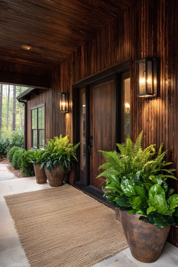 This front porch uses dark siding paired with light flooring and tall planters for contrast. Clean lines keep the layout simple while lighting adds warmth. The overall look feels modern but approachable.