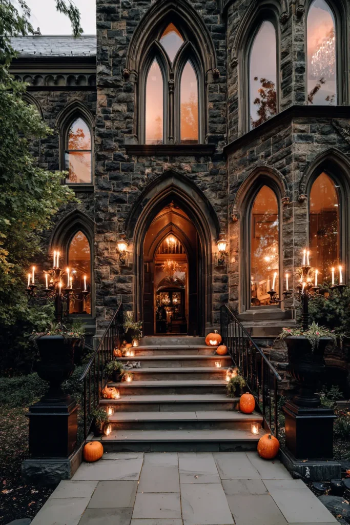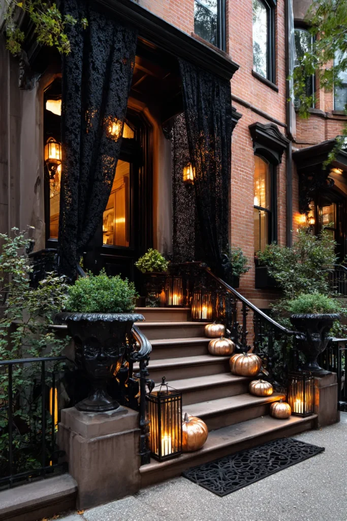 This city brownstone proves Halloween décor can be chic and dramatic at the same time. Black lace-like curtains frame the entry, while metallic golden pumpkins sit along the stairs glowing softly with candlelight. Tall lanterns add structure to the look, and the warm lights from inside make the entire setup feel rich and inviting.