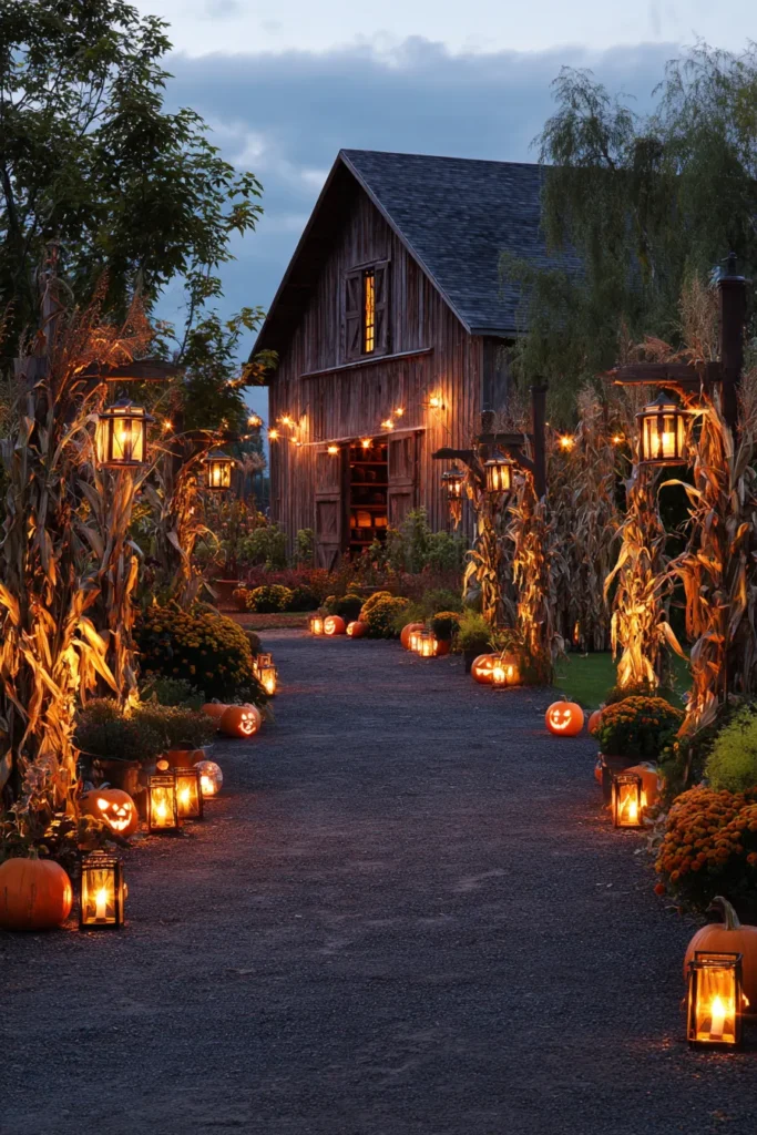 This rustic barn entrance is lined with glowing jack-o’-lanterns and tall cornstalks, each paired with lanterns that light the way. String lights overhead add a touch of sparkle, while potted mums bring in a cozy harvest vibe. The whole setup feels like a magical path leading straight into a Halloween party in the barn.