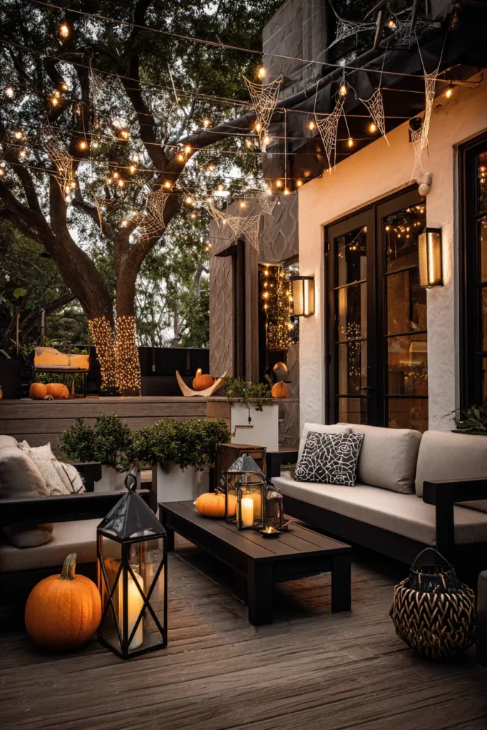 What I love here is that it shows you don’t need to go over the top to feel festive. A few pumpkins, some lanterns, and creative string lights instantly transform an everyday patio into the perfect Halloween hangout spot.