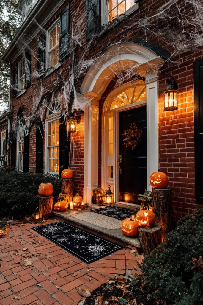 This stately brick home embraces Halloween with glowing jack-o’-lanterns perched on rustic wood stumps at the entry. Cobwebs stretch across the brick façade, making the whole house look hauntingly beautiful. Lanterns add a warm glow, while a wreath on the door keeps the design polished and welcoming.