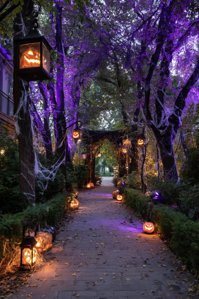 This walkway feels like stepping into a haunted fairytale with glowing jack-o’-lanterns tucked among the greenery. Cobwebs stretch across branches, while purple floodlights wash the trees in a magical glow. Hanging lanterns with carved pumpkins create an arch that’s both eerie and enchanting.