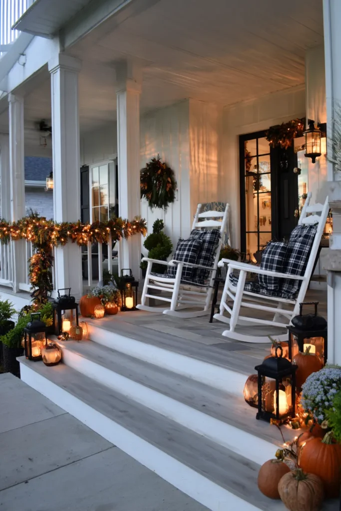 This front porch keeps it sweet and simple with plaid pillows on rocking chairs, glowing lanterns along the steps, and a touch of garland wrapped in twinkle lights. Pumpkins in soft tones fill in the gaps, giving the whole porch a warm autumn glow. It feels welcoming, classic, and perfectly festive without being too spooky.