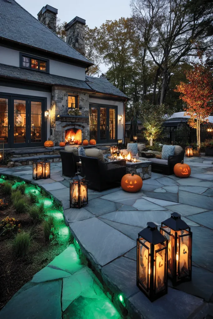 This gorgeous stone patio feels like a cozy autumn retreat. Lanterns flicker along the edges while jack-o’-lanterns add just the right amount of Halloween spirit. A fireplace glows warmly against the house, with cushioned chairs and a fire pit in the center that make the space look inviting for an evening gathering. Green ground lighting along the landscaping adds a subtle pop of drama.