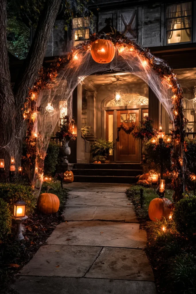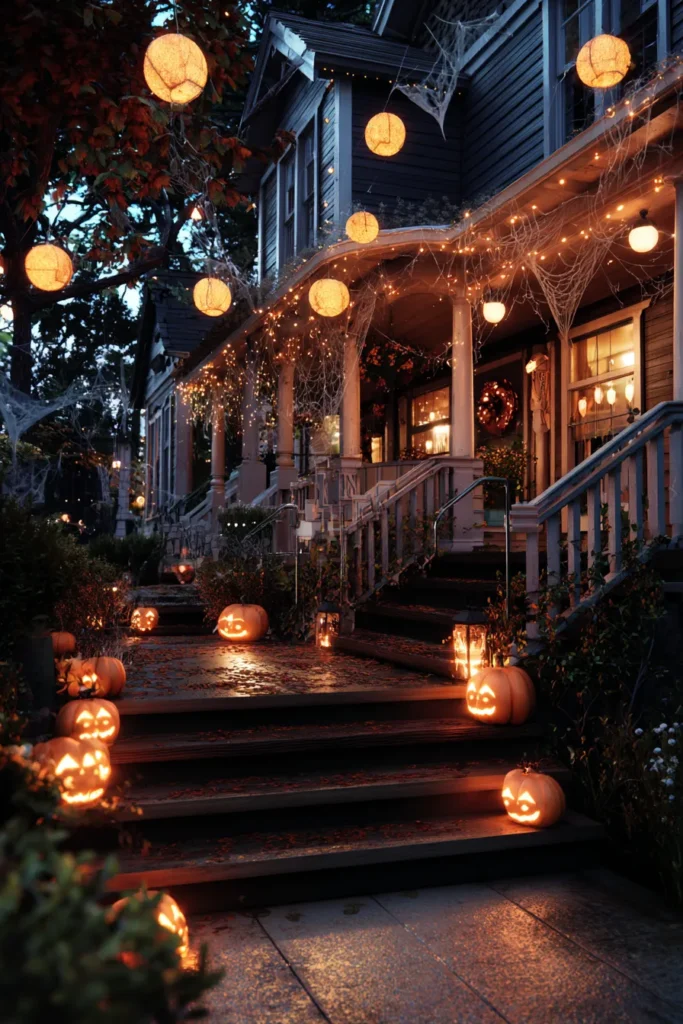 I can’t help but smile at this one. The hanging lights feel so whimsical, almost like floating pumpkins lighting the way. It’s playful, cozy, and would definitely make me want to stroll right up to the door just to admire all the details.