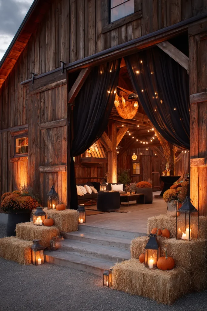 This rustic barn is styled to perfection with hay bales stacked at the entrance, each topped with glowing pumpkins and lanterns. Black curtains draped across the opening add a dramatic flair, while string lights inside hint at a cozy autumn gathering waiting within. Potted mums in rich autumn tones finish the look beautifully.