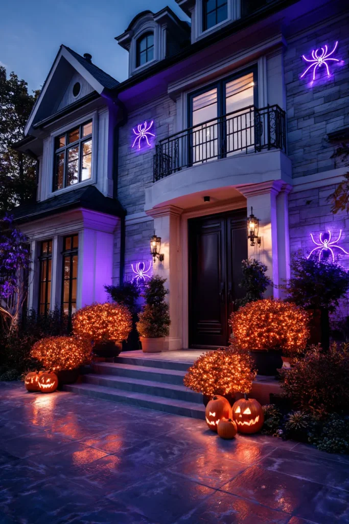 This grand home takes Halloween glam to the next level with glowing orange shrubs, jack-o’-lanterns on the steps, and bold purple neon spiders crawling across the façade. The lighting makes the stone exterior pop, turning the whole house into a festive and slightly spooky showpiece.