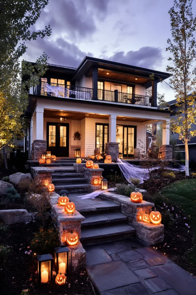 This home instantly grabs attention with its grand staircase lined in glowing jack-o’-lanterns. The carved pumpkins create a playful yet slightly spooky trail that guides guests right up to the front door. Cobwebs draped along the shrubs and porch railings add to the haunted charm, while lanterns with flickering candles bring in a cozy glow. It’s dramatic, welcoming, and absolutely perfect for setting the Halloween mood.