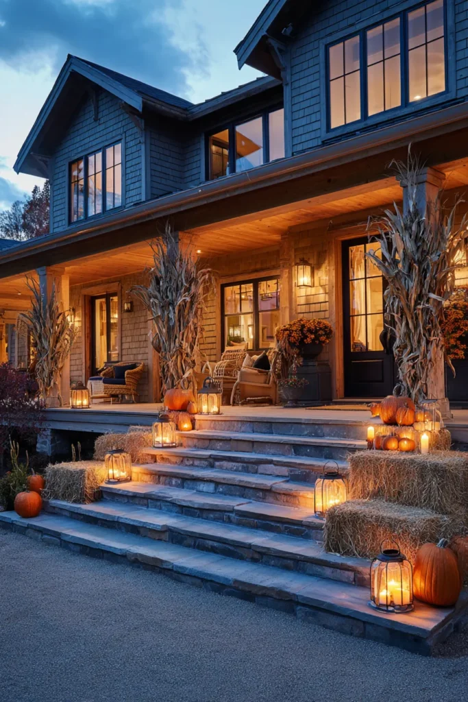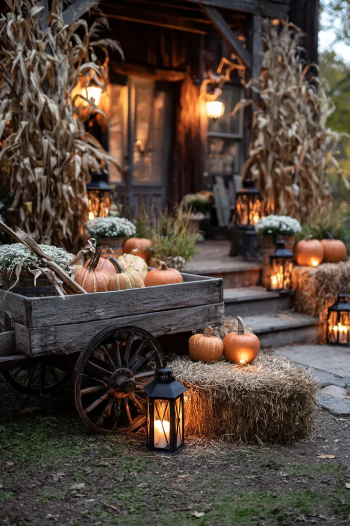 This farmhouse porch feels like pure autumn magic with cornstalks framing the doorway, pumpkins perched on hay bales, and a rustic wooden wagon overflowing with gourds. Lanterns glow softly around the setup, making the whole scene look like it belongs in a storybook harvest festival.