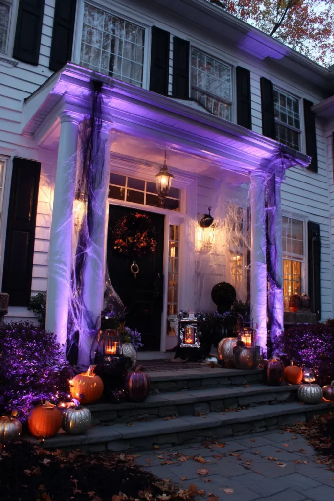 This white colonial-style home makes a bold statement with dramatic purple lighting washing over the columns. Cobwebs stretch across the entryway, while a mix of orange, black, and metallic pumpkins line the steps. Lanterns glow at the base, giving the whole porch a glamorous and slightly spooky vibe.