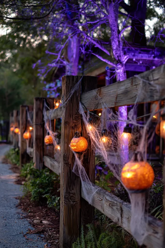 This design turns a simple wooden fence into a glowing Halloween feature. Small pumpkin-shaped lanterns hang along the rails, with cobwebs draped across for a spooky effect. Purple lighting in the trees adds depth and atmosphere, creating the perfect backdrop for trick-or-treaters walking by.