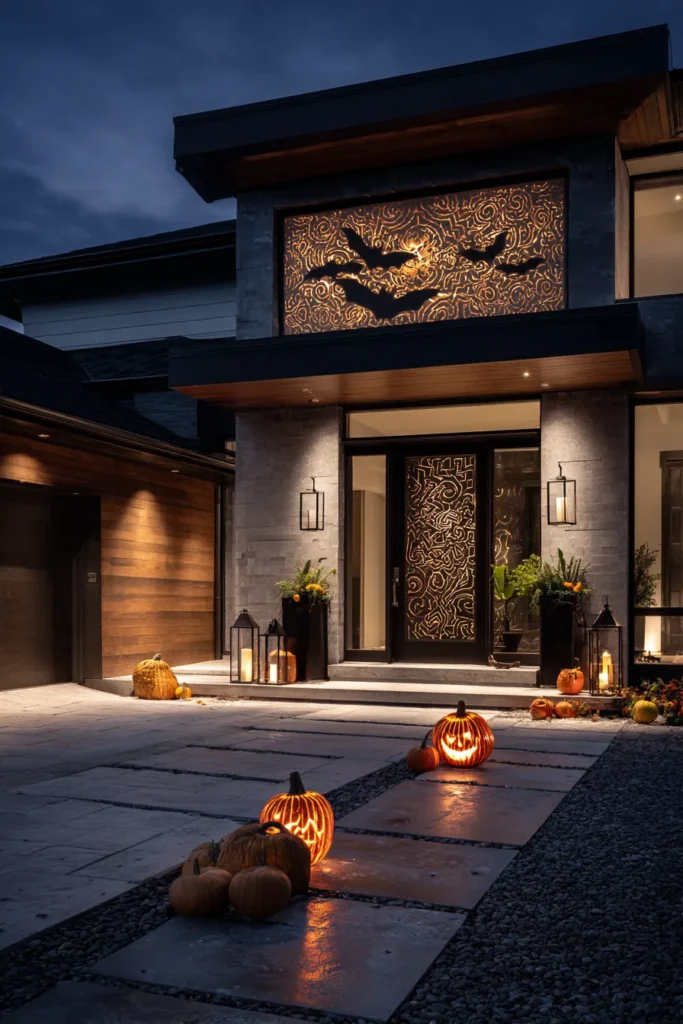 This modern home takes a sleek approach to Halloween with laser-cut panels glowing with flying bats above the entryway. The minimal pathway is lined with jack-o’-lanterns and lanterns, creating a clean yet festive welcome. The combination of sharp architecture and soft pumpkin light makes for a striking balance.