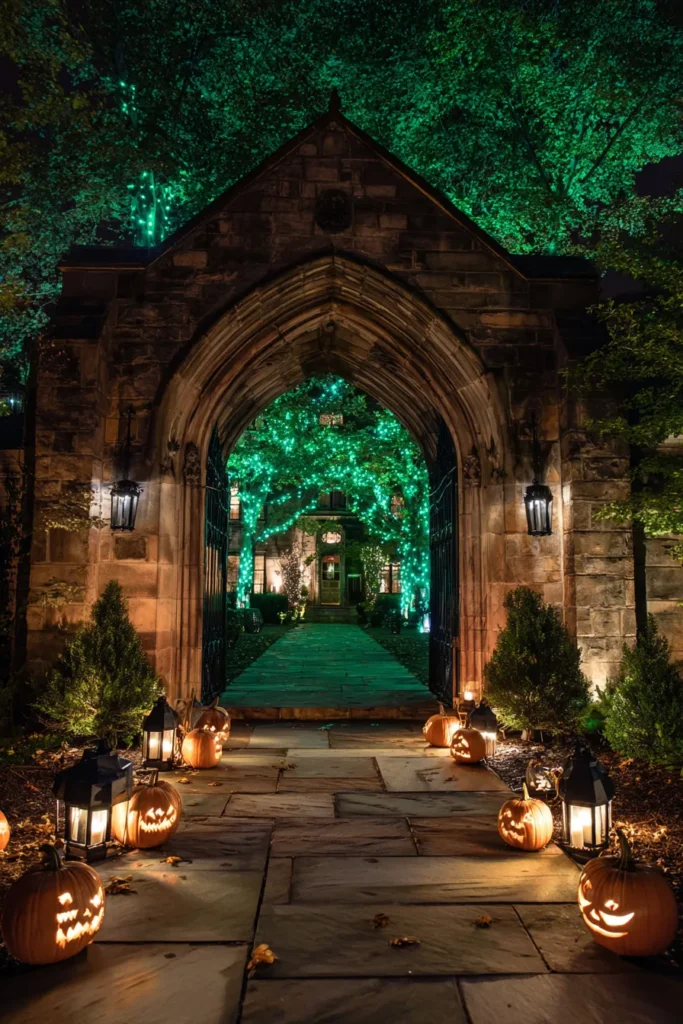 This stone archway sets the stage for a truly dramatic Halloween entrance. Green lights in the trees create an eerie glow, while jack-o’-lanterns and lanterns line the path leading inside. The towering arch feels like the doorway to a haunted mansion, making it equal parts spooky and magical.
