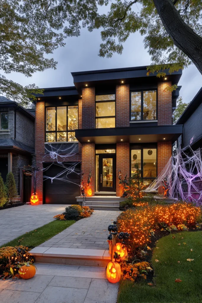 This sleek brick-and-glass home leans into Halloween with oversized spider webs stretched across the façade and glowing jack-o’-lanterns dotting the walkway. The addition of orange twinkle lights in the landscaping creates a sparkling path that feels both modern and spooky. The clean lines of the house contrast so nicely with the playful webbing, giving it a chic haunted-house feel.