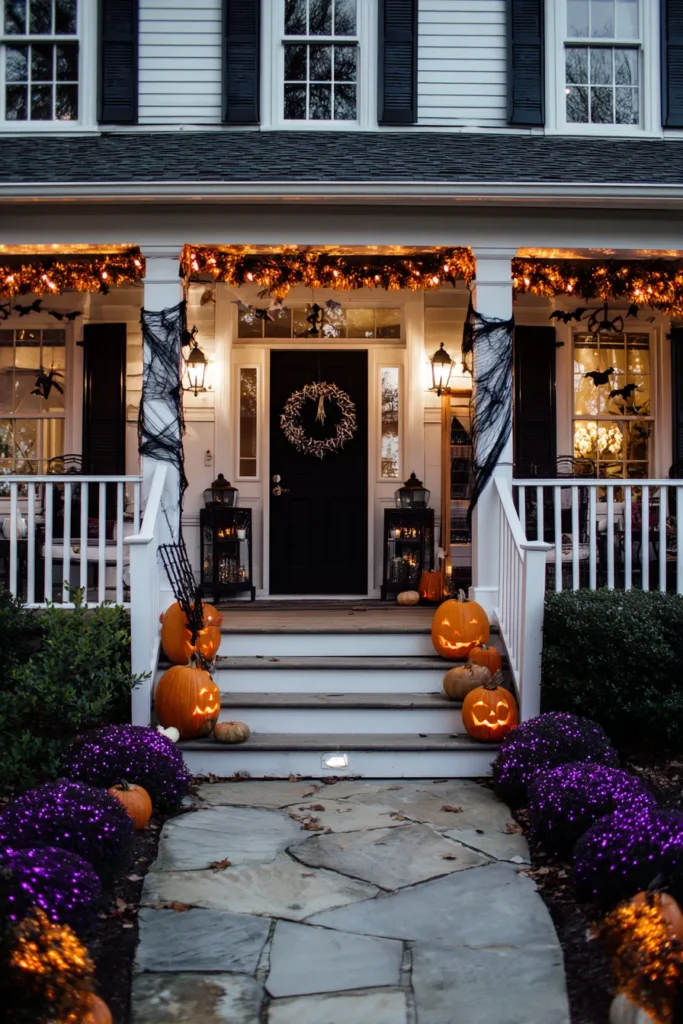 This design brings in a fun twist by pairing traditional jack-o’-lanterns with glowing purple mums that line the walkway. The porch railing is wrapped with strands of orange lights and a touch of black gauzy fabric, while lanterns and pumpkins cluster at the doorstep for a welcoming glow. The black door and shutters tie everything together, giving the whole setup a crisp and classic Halloween look.