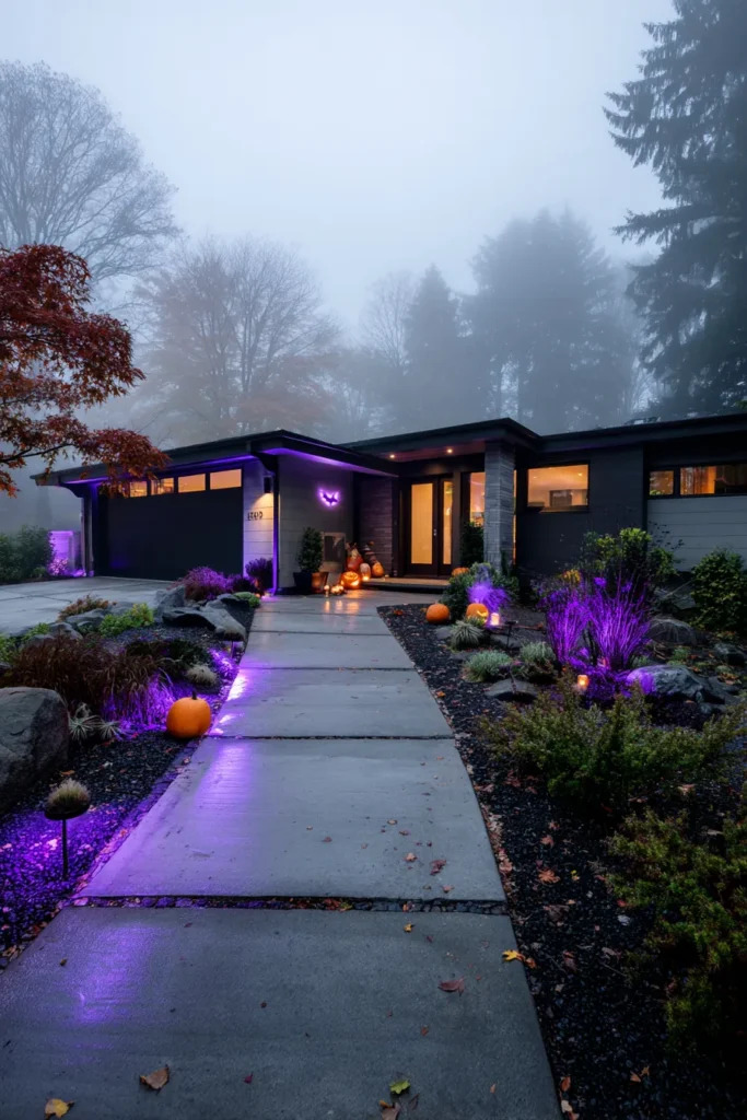 This sleek modern home turns into a haunting masterpiece with clever use of color and light. The pathway is lined with glowing purple spotlights that make the landscaping pop, while pumpkins are scattered naturally along the walk. Near the entry, carved jack-o’-lanterns cluster together, their warm orange glow perfectly balanced by the mysterious purple hue. A glowing bat-shaped light on the wall adds just the right spooky touch without overwhelming the clean design.