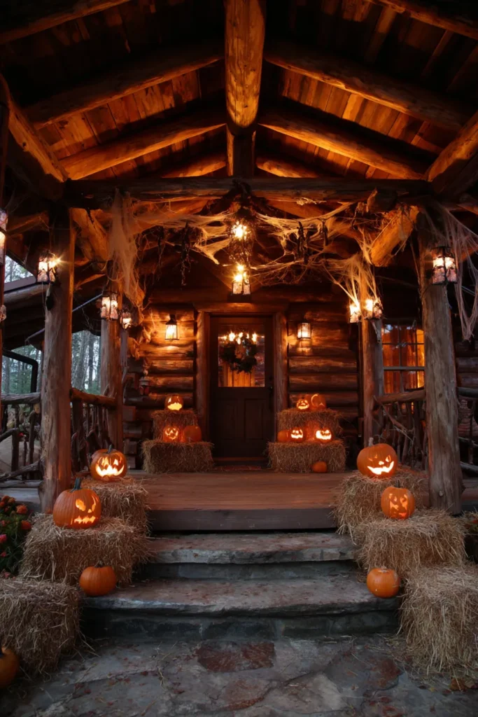 I absolutely adore this style because it feels so authentic. It’s the kind of setup that makes you want to sip cider by the fire after handing out candy. Simple elements like hay bales and pumpkins can look downright magical when paired with the natural charm of a cabin.
