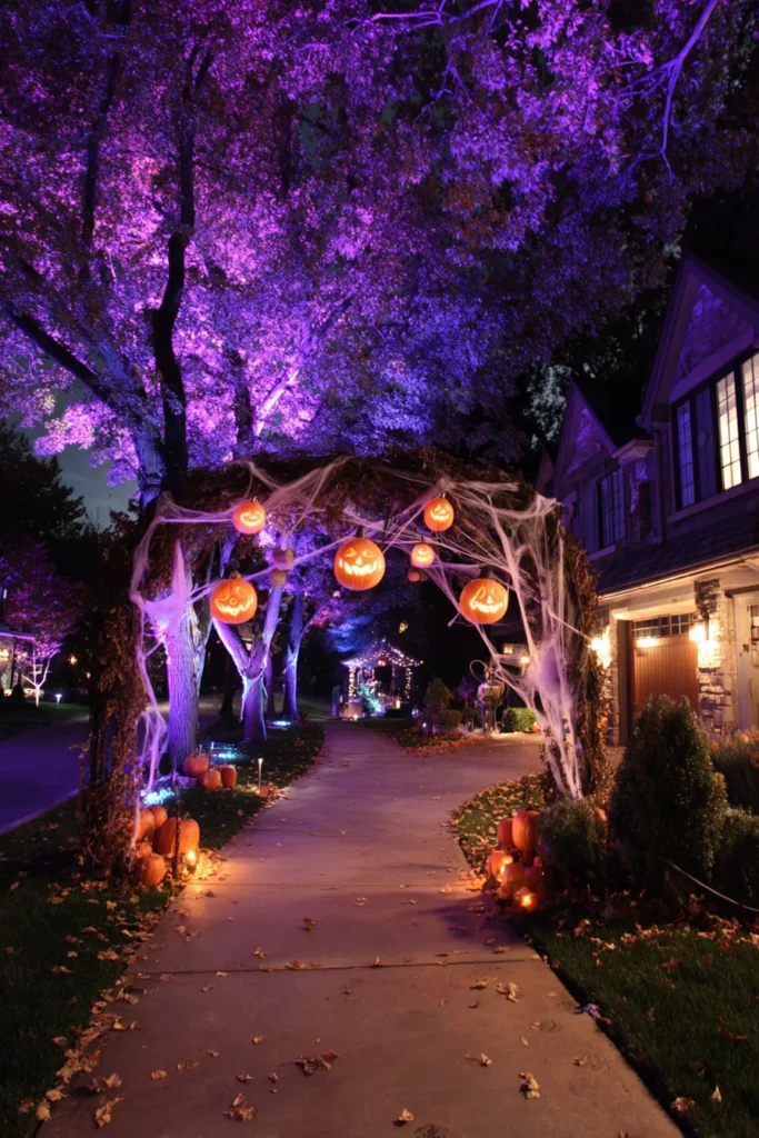 This neighborhood walkway becomes the star of Halloween night with a glowing arch of carved jack-o’-lanterns hanging overhead. Cobwebs stretch across the arch for added drama, while purple floodlights illuminate the surrounding trees, turning them into a glowing canopy. Pumpkins and lanterns line the path, creating a spectacular entrance.