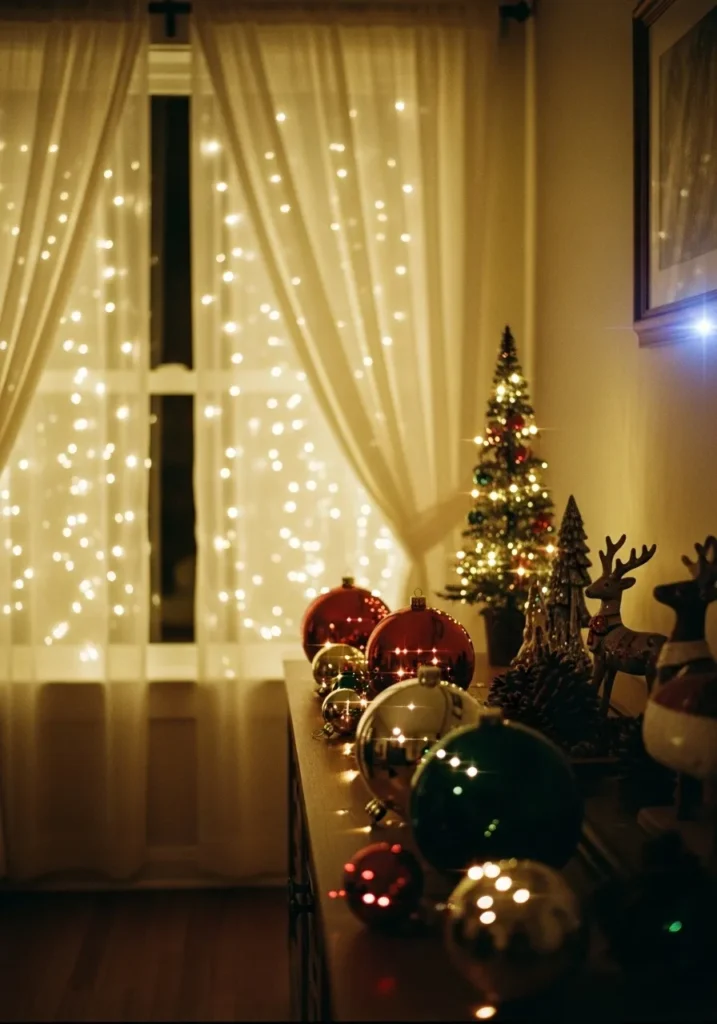 Sheer curtains sparkle with strands of glowing fairy lights behind them, while festive ornaments and a tiny Christmas tree fill the foreground. The whole space feels cheerful, glowing with that familiar holiday warmth.