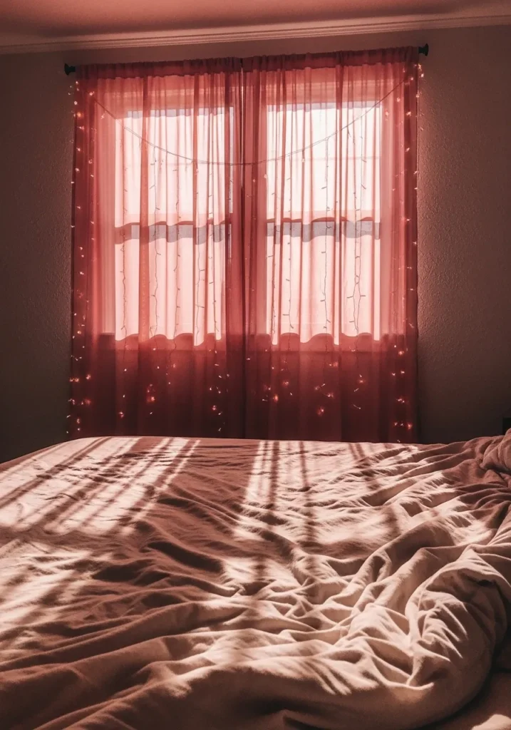 Soft pink curtains glow gently with warm fairy lights, letting the light filter through in a dreamy blush tone. The sunlight hits the fabric just right, painting the room in a rosy hue that feels tender and romantic.