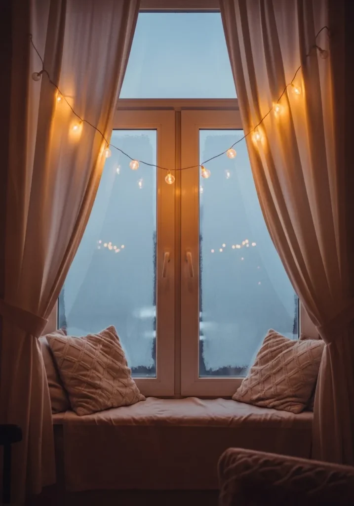 Soft white curtains frame a frosty window where a string of warm bulb lights hangs in a gentle curve. The glow from the lights reflects softly on the pillows, making this little nook feel like the perfect spot for a winter evening. The simplicity of the setup adds to its charm, proving that cozy doesn’t need to be complicated.