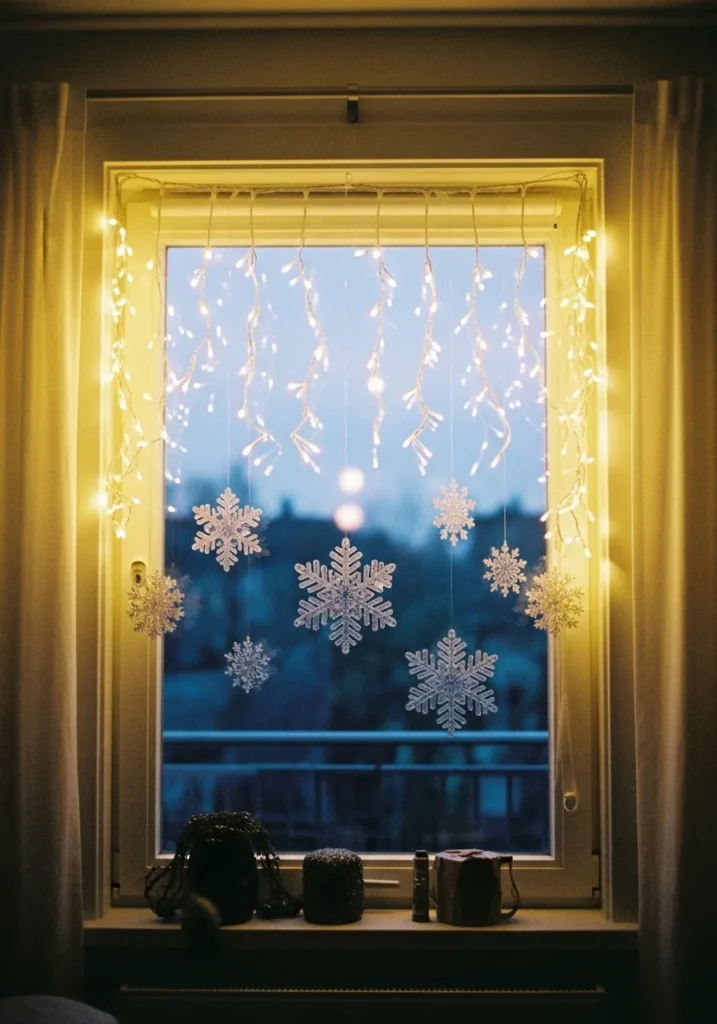 Icicle lights dangle elegantly across the curtain rod, with shimmering snowflake ornaments hanging below. The mix of white lights and frosty details makes the window sparkle like a winter wonderland. The soft glow reflects beautifully against the evening sky outside, creating a magical festive feel.
