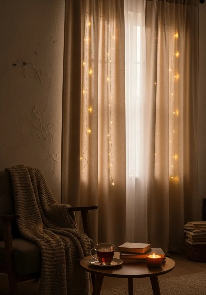 Soft beige curtains glow gently behind strands of warm fairy lights, casting a cozy light across the chair, blanket, and candlelit table. The neutral tones keep everything calm and soothing, while the lights add just the right amount of festive sparkle.