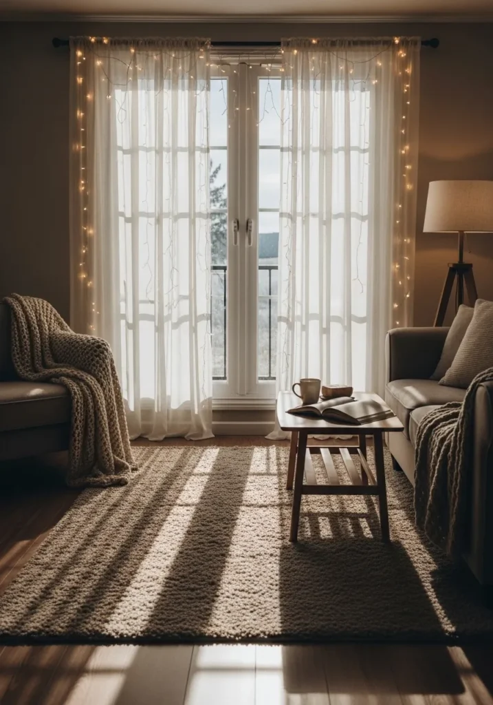 Delicate fairy lights frame a pair of sheer white curtains, letting the winter sunlight stream in while keeping the space soft and inviting. The warm tones of the furniture and rug tie the look together perfectly, creating a room that feels both bright and cozy.