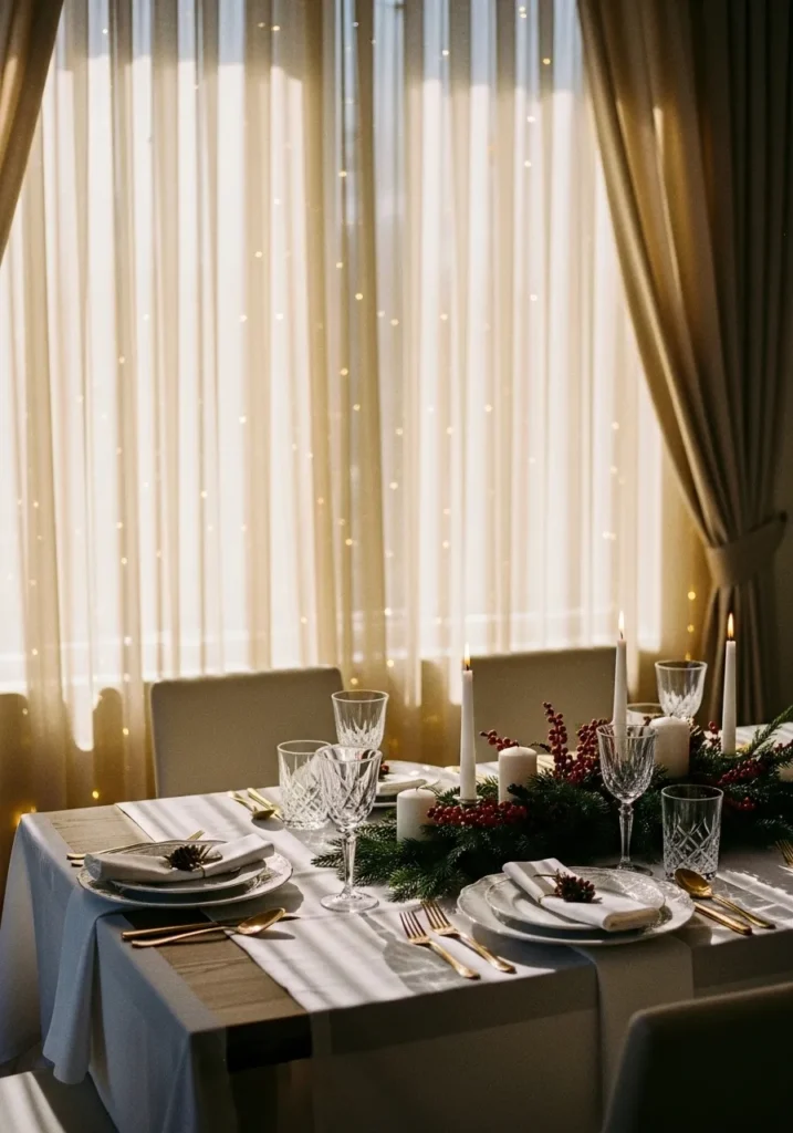Golden curtain lights shimmer behind soft drapes, framing an elegant Christmas dining table. The setup features crystal glassware, white linens, gold flatware, and a centerpiece of evergreens and red berries. It feels timeless, romantic, and so ready for a cozy holiday dinner.