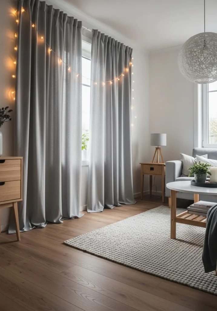 Cool gray curtains hang elegantly in a Scandinavian-inspired living room, with a string of fairy lights gently swooping across the top. The room features light wooden furniture, neutral tones, and soft daylight filling the space. The simplicity makes the glow of the lights feel even more inviting.