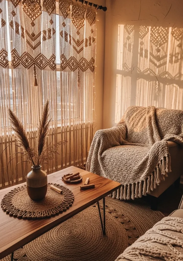 Macramé curtains with intricate patterns let golden sunlight pour in, while fairy lights woven through the threads add a magical sparkle. The warm wood tones, woven textures, and pampas grass decor create a relaxed bohemian vibe that feels both earthy and festive.