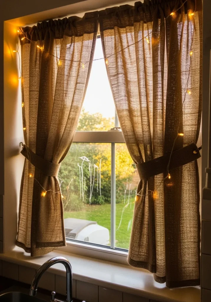 Burlap curtains tied neatly at the center frame a sunny garden view, while strands of golden fairy lights loop casually around the window. The texture of the fabric, paired with the rustic glow of the lights, makes the kitchen feel homey and full of character.