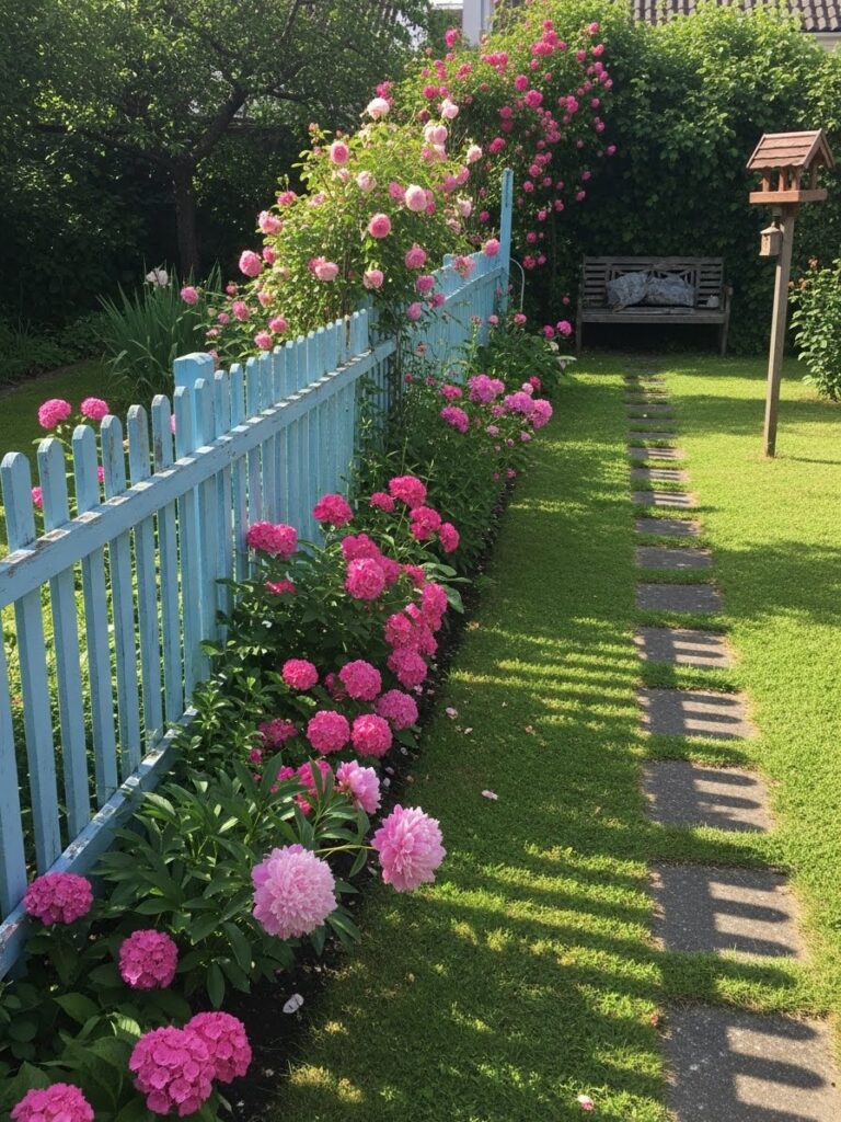 This garden fence is painted in a soft, dusty blue that feels calm and cheerful at the same time. The simple wooden pickets are lined with lush pink flowers that spill gently over the edges. A narrow stone path runs alongside the fence, guiding you through the garden in the most inviting way. Everything feels balanced, colorful, and slightly whimsical without being overdone.