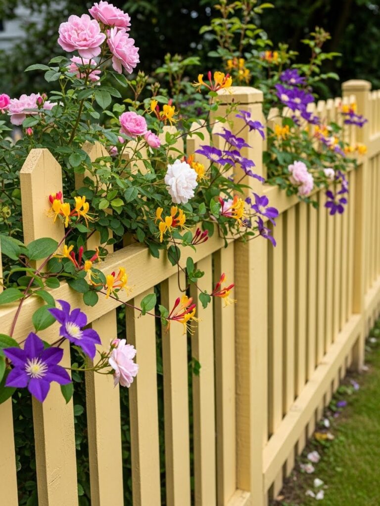 This soft yellow picket fence feels cheerful and warm, with climbing flowers weaving gently through the slats. Pink roses, purple clematis, and golden blooms spill over the top, creating a layered and romantic look. The fence itself is simple and classic, letting the flowers do most of the talking. Everything feels bright, happy, and full of summer energy.