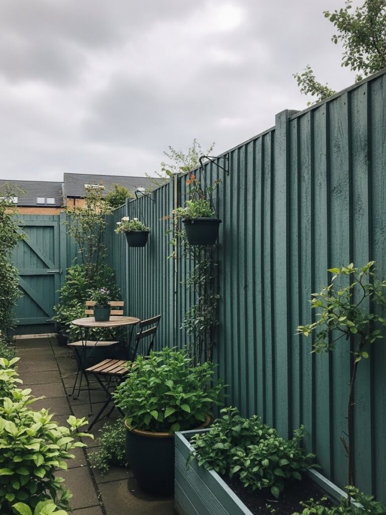 This deep green fence creates a quiet and intimate garden corner, with vertical panels adding height and privacy. Hanging planters and potted greenery soften the solid structure and add layers of interest. A small table and chairs tucked inside make the space feel like a secret retreat. Everything feels calm, private, and beautifully tucked away.