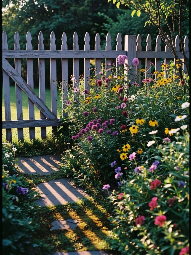 This weathered gray fence pairs perfectly with a wildflower border filled with pinks, yellows, and soft purples. The aged wood adds texture and a slightly rustic feel. A simple gate and stone path lead you gently through the garden. It feels relaxed, natural, and full of quiet charm.