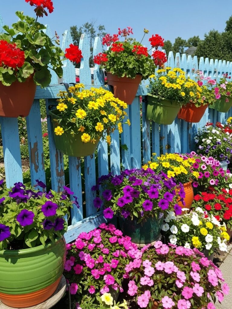 This bright blue fence is lined with hanging flower pots overflowing with bold reds, yellows, purples, and pinks. The paint is slightly chipped, which adds character and keeps it from feeling too polished. The mix of pot colors and flowers creates a playful and energetic look. It feels bold, creative, and full of personality.