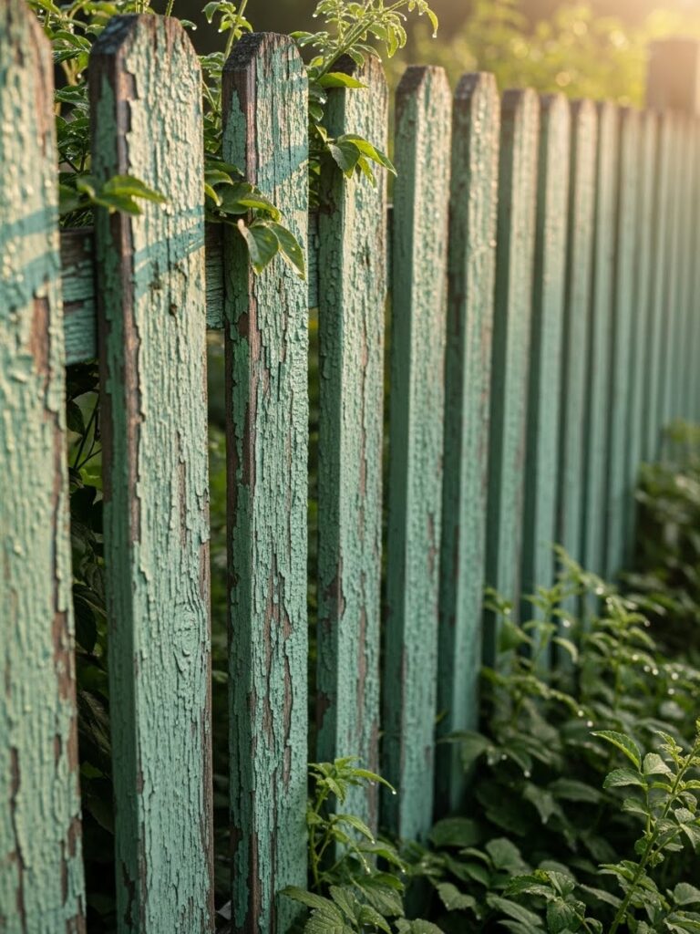This fence features narrow wooden pickets painted in a muted green shade, with beautifully peeling paint that reveals layers of age and texture. Small vines and leafy plants grow naturally around the base and between the slats, making the fence feel gently reclaimed by the garden. Warm sunlight catches the rough surface, highlighting every crack and brushstroke. It feels quiet, rustic, and full of old garden charm.