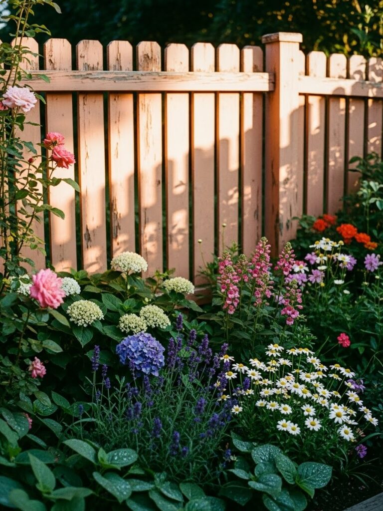 This peach toned fence runs along a lush garden bed filled with pink hydrangeas, yellow blooms, and tall purple flowers. The paint looks slightly worn, which adds charm and keeps it from feeling too perfect. The fence frames the garden neatly while still feeling soft and welcoming. It feels colorful, cozy, and thoughtfully planted.