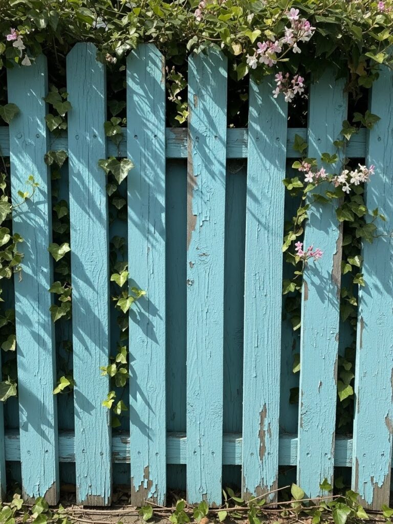 This light blue fence is covered with climbing ivy and delicate flowering vines that weave through the slats. The paint shows signs of wear, adding texture and character to the surface. Soft shadows from nearby plants dance across the fence throughout the day. It feels fresh, charming, and slightly whimsical.