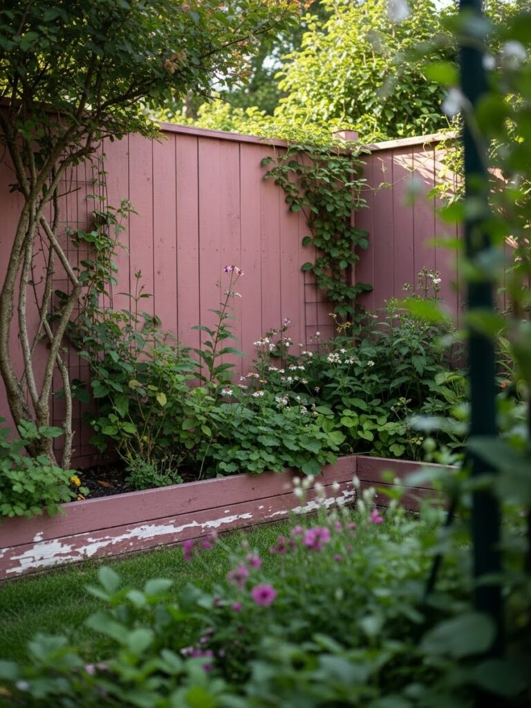 I think this fence is incredibly endearing. The pink is subtle and warm, not overpowering at all. Paired with the potted plants, it feels personal and lovingly styled. It reminds me how small details can completely transform a garden corner.