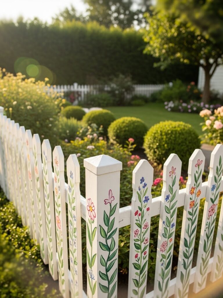 This white fence is decorated with hand painted floral designs that add personality and color to every picket. Each flower feels slightly different, giving the fence a charming handmade look. The garden behind it is soft and green, which lets the painted details really shine. Everything about it feels thoughtful and creative.