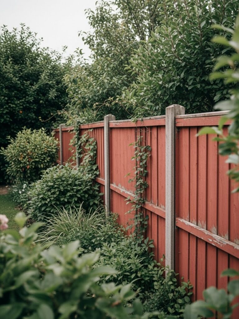This fence features warm red wooden panels paired with sturdy concrete posts that give it a solid, grounded feel. Creeping plants and leafy shrubs grow closely around the base, softening the structure and blending it into the garden. The paint looks gently worn, which adds character instead of looking neglected. It feels private, cozy, and naturally framed by greenery on all sides.