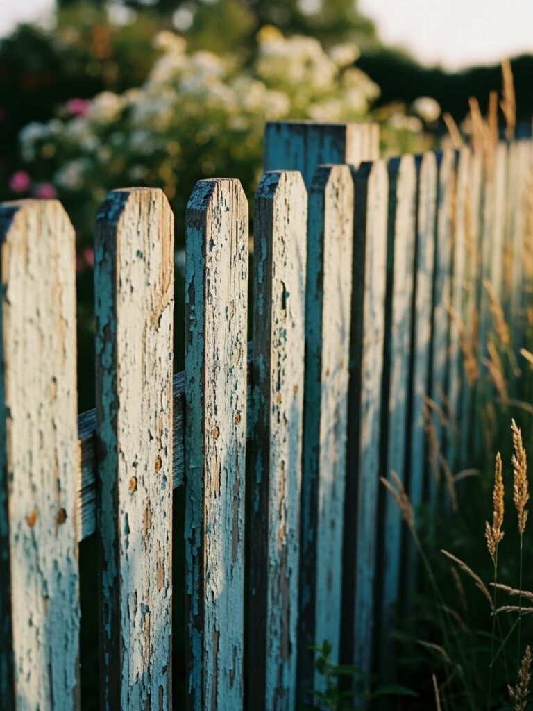 This pale blue picket fence shows off beautifully chipped paint and visible wood texture. The vertical slats feel classic, while the weathering gives it a relaxed and almost coastal vibe. Tall grasses and soft greenery nearby make the fence feel like part of the landscape rather than a hard boundary. Everything about it feels calm and slightly nostalgic.